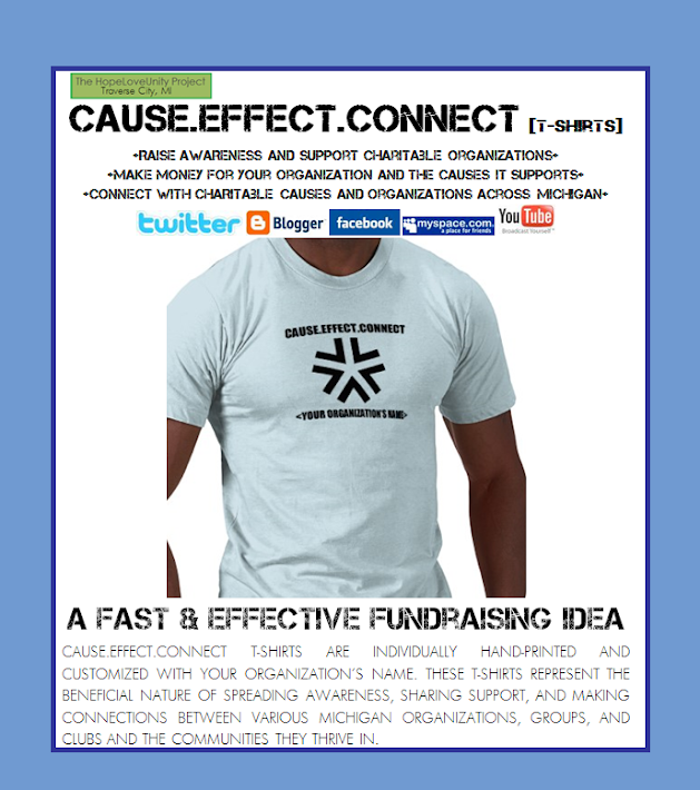 IN ADDITION TO SUPPORTING YOUR ORGANIZATION’S CAUSES, YOU WILL ALSO BE HELPING TO SUPPORT VARIOUS CHARITABLE ORGANIZATIONS THROUGHOUT MICHIGAN. YOUR ORGANIZATION CAN SIMPLY REDISTRIBUTE CAUSE.EFFECT.CONNECT T-SHIRTS TO SPREAD AWARENESS ABOUT YOUR ORGANIZATION, OR YOU CAN QUICKLY AND EFFICIENTLY RAISE FUNDS BY RESELLING THE CUSTOMIZED T-SHIRTS TO SUPPORTERS, DONORS, MEMBERS, AND OTHERS.